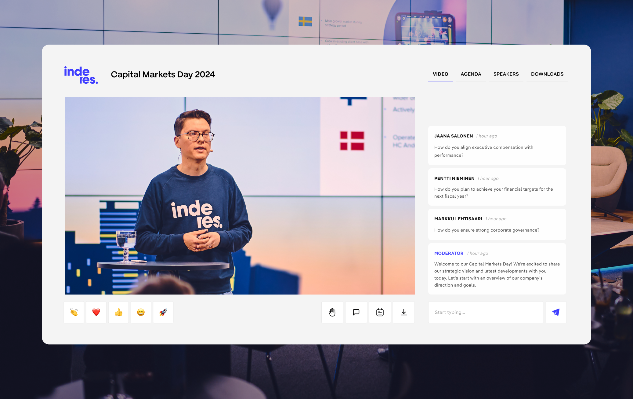 Alla näkyvät kuvat ovat Inderesin Videosync-tuotteesta, joka on virtuaalitapahtumien järjestämiseen kehitetty palvelu. Videosyncin avulla on järjestetty yli 20 000 tapahtumaa, ja sitä käyttää yli 500 asiakasta eri puolilla Pohjoismaita.
